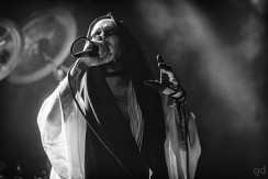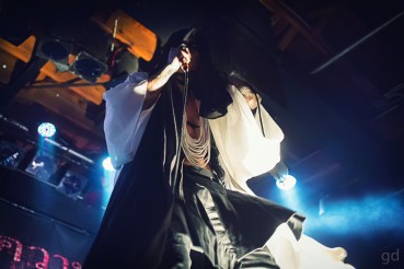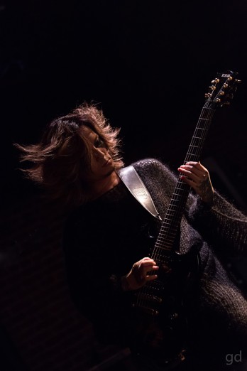 Kyo’s outfit tonight is reminiscent of a Japanese monk’s; a flowing white robe and black headscarf on top of tight black pants with rope necklaces around his neck. Combined with the pinhole contacts it’s a very intimidating setup. As the night went on the headscarf would go followed by the robe revealing a black leather harness hidden underneath. It is at this point Kyo’s many tattoos are visible and for now only he knows their significance and meaning. direngrey kyoHe sports the bald head much like the last time the band was here for 2013’s “Ghoul” tour. Die, Toshiya, and Kaoru are all cloaked in black with Shinya the only one contrasting in white. Kaoru’s hair is decidedly out of control and radiates from his head. The band has come a long way from their visual kei days. Being a metal show there are fans everywhere, naturally. Kyo’s loincloth and various members’ hair were flying about for almost the whole show.