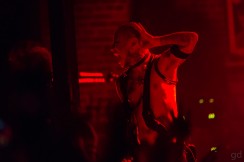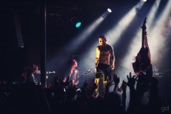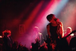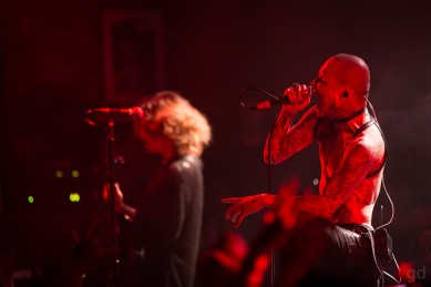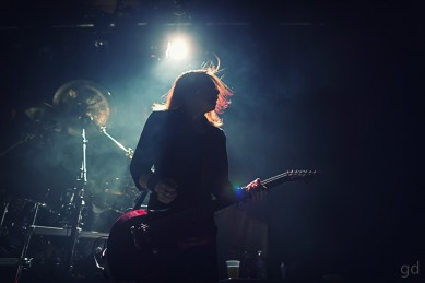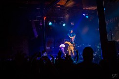 A short break allows me and the lone other photographer to file out of the pit and take our places somewhere on the edges of the room stage left. I can finally see just how packed it is up front; the mass of humanity writhes and ebbs and flows. There’s also a distinct lack of camera phones in the air which I give the fans props for. A few are on the side nearest me but it looks like the bulk of people are here to get into the music. I’m not quite sure if there is a mosh pit. There well could be but it’s probably very compressed. I’m pretty much trapped on this side of the room but that’s alright. Wouldn’t be the first time it’s happened here after photos (nevermind that whole time I was in this spot for May’n) and there’s an electric fan circulating air and the bar right next to me.