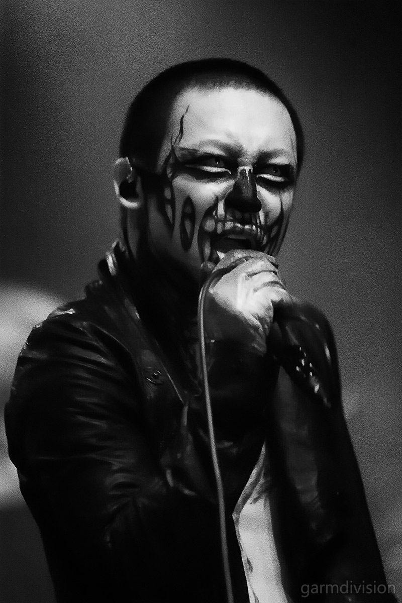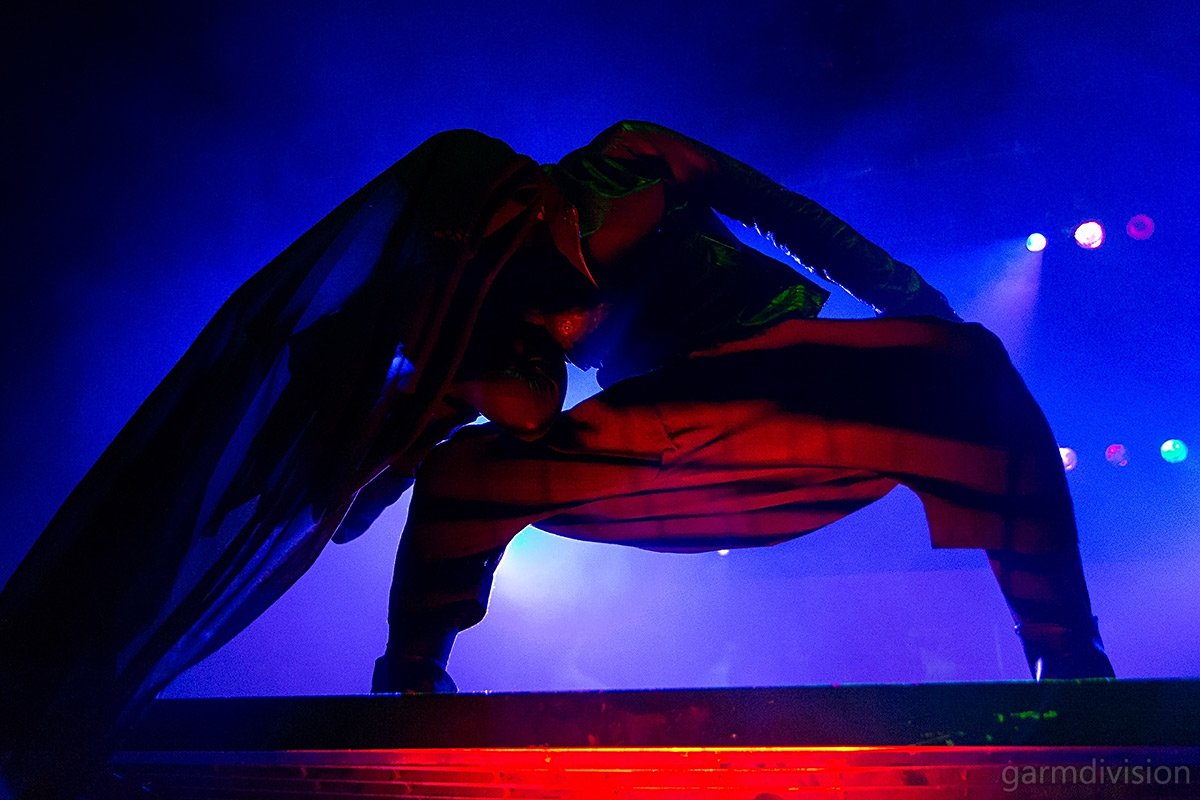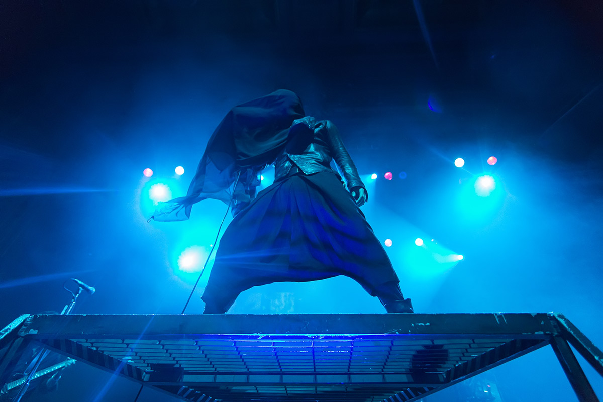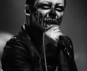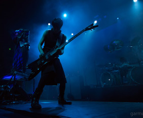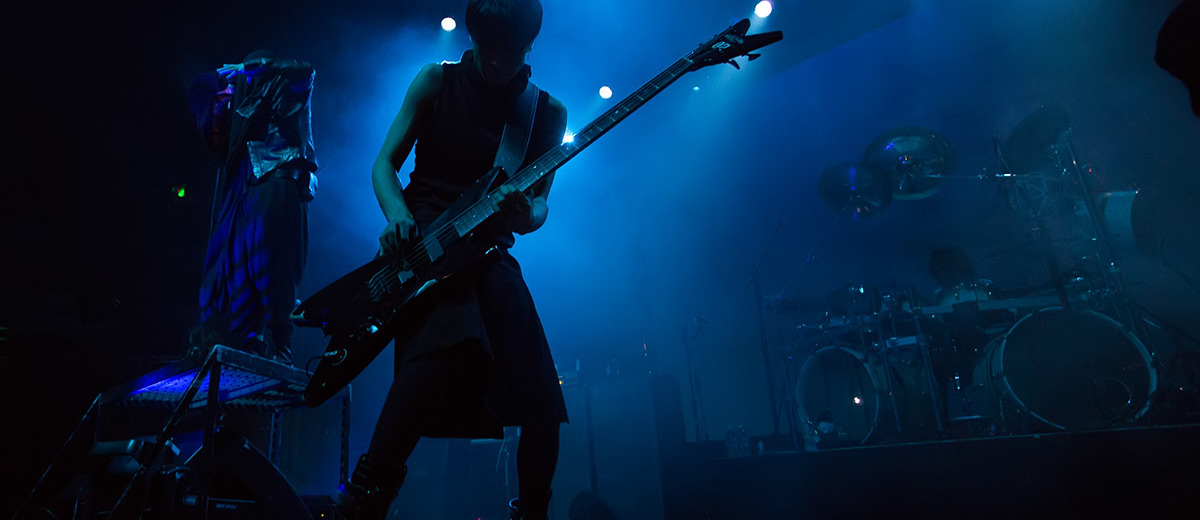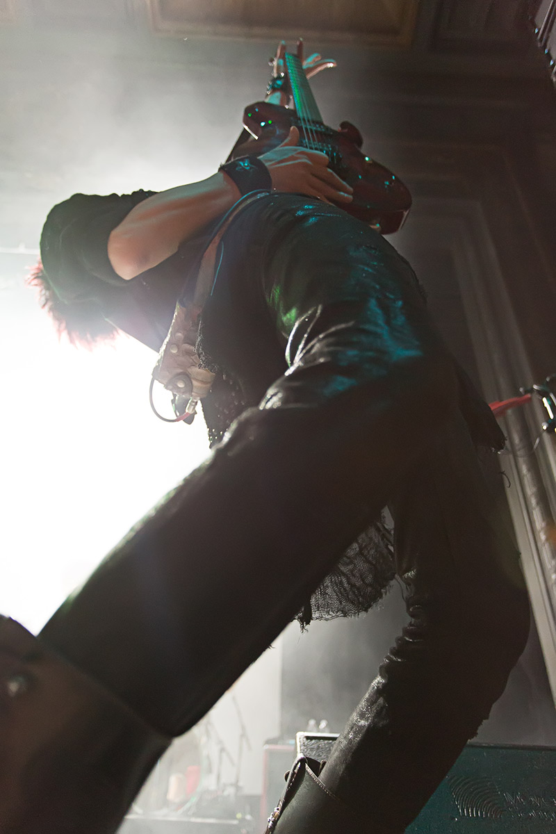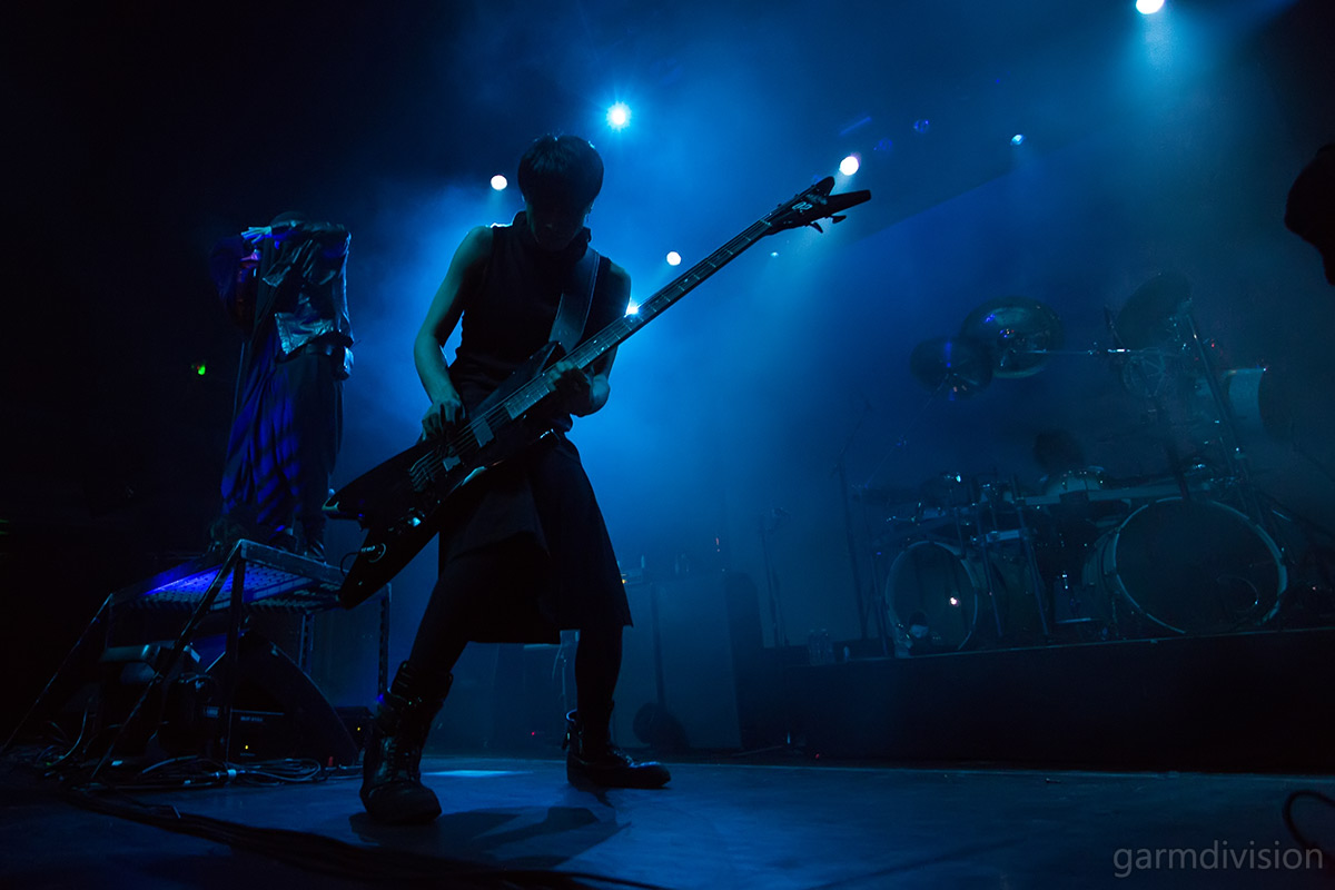 Frontman Kyo is the heart of the band and his showmanship and vocal variety are the band’s trademark. He entered the stage with a veil covering most of his upper body, only uncovering himself for a few seconds here and there so that audience members could get a glimpse. The band encorporated video as part of the performance and one example of this is where Kyo performed the entirety of The Blossoming Beelzebub with his back to the audience. A microphone stand in the rear played host to a camera whose feed was projected onto a screen behind the band. Kyo played with the fixed position by alternating his distance as well as coming in and out of the light to hide himself. The twenty-foot screen let the audience see his face in all its glory; short, almost buzzcut hair framed his skull facepaint and pinpoint circle lenses.