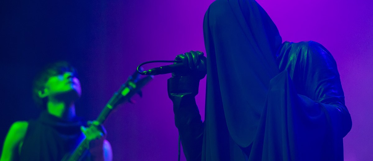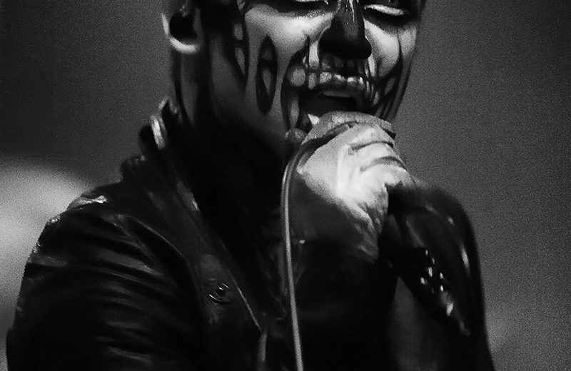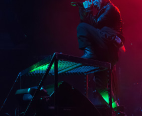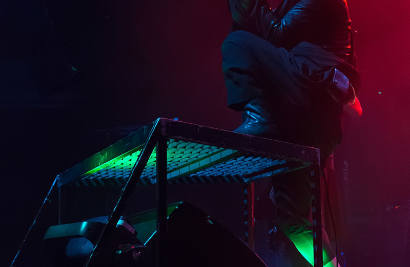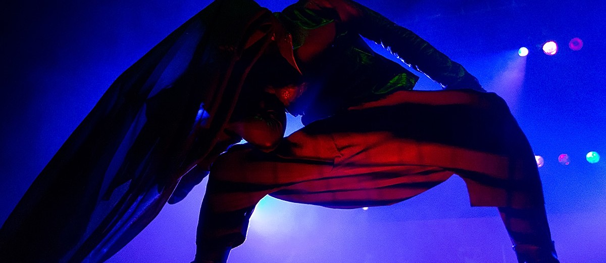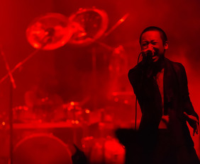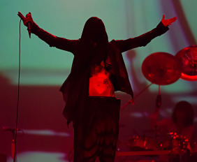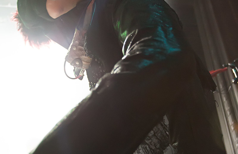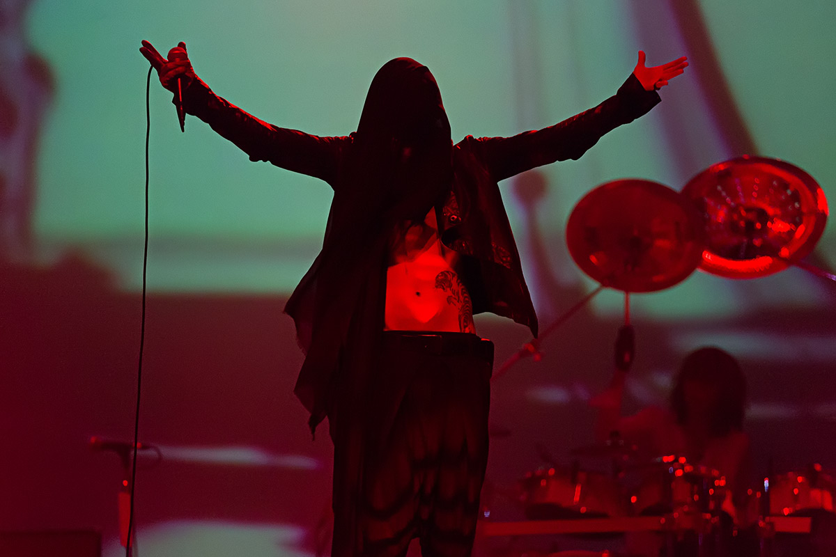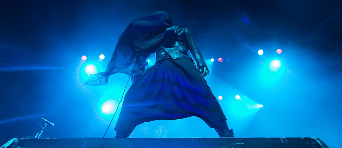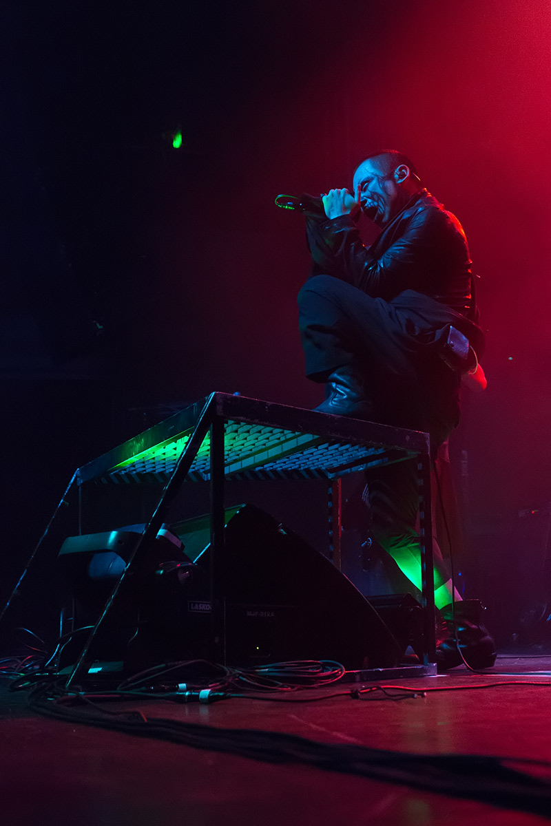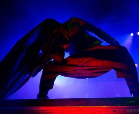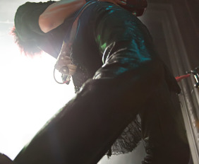 Frontman Kyo is the heart of the band and his showmanship and vocal variety are the band’s trademark. He entered the stage with a veil covering most of his upper body, only uncovering himself for a few seconds here and there so that audience members could get a glimpse. The band encorporated video as part of the performance and one example of this is where Kyo performed the entirety of The Blossoming Beelzebub with his back to the audience. A microphone stand in the rear played host to a camera whose feed was projected onto a screen behind the band. Kyo played with the fixed position by alternating his distance as well as coming in and out of the light to hide himself. The twenty-foot screen let the audience see his face in all its glory; short, almost buzzcut hair framed his skull facepaint and pinpoint circle lenses.